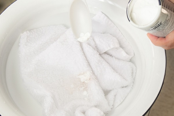 Đối với vết bẩn cứng đầu, hãy tạo hỗn hợp gồm thuốc tẩy oxy (như OxiClean) và nước, thoa lên vết bẩn và đợi vài giờ trước khi giặt bằng nước lạnh.